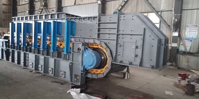 方式二:板式給料機+機械手破碎。運輸高峰時期,建筑廢棄物由收運車運送至原料倉庫內(nèi)暫存,機械手同時對尺寸超過1.5m的大塊物料進行預(yù)破碎,避免在卸料槽進口處架橋。經(jīng)過預(yù)破碎的物料由裝載機上料至位于地坑內(nèi)的板式給料機料倉內(nèi),料倉寬度在1.5m,方便大尺寸物料(如樓板和混凝土塊)進入,通過板式給料機輸送至后續(xù)工藝單元。