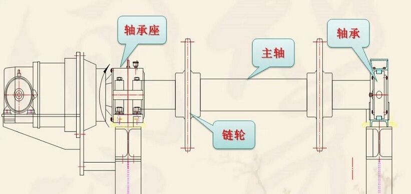 該裝置主要由軸、鏈輪、支承輥等件組成。兩端支撐為滾動軸承,主軸與減速器、空心軸套裝在一起,通過鎖緊盤將其二者連接到一起,達到傳遞扭矩的要求,結(jié)構緊湊。