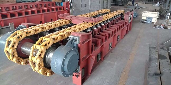 座部件由機架和支承件組成。機架由鋼材焊接而成,支承部件有支重輪、下托輪和縱向?qū)к?,輸送板得到支重輪和縱向?qū)к壍碾p重支持,使支重更均勻合理。牽引鏈基本上不受礦石和自重產(chǎn)生的張力作用,支重輪外側(cè)設計有凸臺,與主、從動輪聯(lián)合作用,成功地杜絕鏈軌跑偏。在機架下方設有下托輪,為方便維修,下托輪為側(cè)裝式。