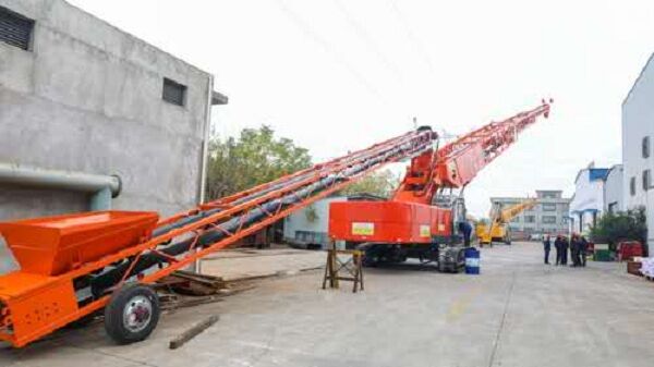 我公司生產(chǎn)的可移動(dòng)式混凝土運(yùn)輸、澆筑設(shè)備——自行帶式混凝土布料機(jī),小時(shí)澆筑強(qiáng)度可達(dá)270m3。為了解決混凝土布料機(jī)的供料問(wèn)題,自行研制了可移動(dòng)式上料平臺(tái)。