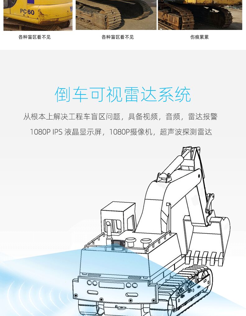本產(chǎn)品是針對大型機械和卡車貨車倒車視野不好的環(huán)境設(shè)計和制作的倒車?yán)走_。通過攝像頭將車后環(huán)境通過視屏直接顯示到顯示屏上,讓駕駛員直觀了解車后環(huán)境;另外,超聲波探頭精確探測車后障礙物距離,并且在顯示屏顯示障礙物距離并發(fā)出其它警示信號。從而使駕駛者在探測范圍內(nèi)能方便地判斷車后障礙物的距離、方位和所在區(qū)域,得到及時警示,達到安全倒車的目的。此款產(chǎn)品具有防水、防震、防干擾,探測距離遠等優(yōu)點。