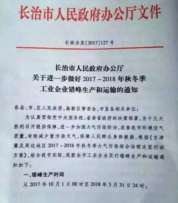 山西省長治市也發(fā)布《關(guān)于進(jìn)一步做好2017-2018秋冬季工業(yè)企業(yè)錯(cuò)峰生產(chǎn)和運(yùn)輸?shù)耐ㄖ贰R笞?017年10月1日00時(shí)起至2018年3月31日24時(shí),水泥(含粉磨站)等建材行業(yè)企業(yè)全部停產(chǎn)。