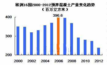 根據(jù)相關(guān)數(shù)據(jù)統(tǒng)計,2006年歐盟預(yù)拌混凝土年產(chǎn)量3.96億立方米,達(dá)到近年高峰值,之后產(chǎn)量逐年下降,2012年預(yù)拌混凝土年產(chǎn)量僅2.4億立方米。