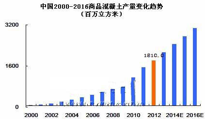 中國商品混凝土市場自2000年開始,增長就大幅度提升,2000-2012年平均增幅高達(dá)30%左右。但受全球經(jīng)濟(jì)危機(jī)的影響,中國2008年的商品混凝土市場也受到了不小的沖擊,商品混凝土的增長率大幅度下滑。不過與歐盟、美國等其他發(fā)達(dá)國家混凝土負(fù)增長率而言,中國混凝土市場表現(xiàn)的還是十分活躍的。這也反映出了中國的商品混凝土行業(yè)進(jìn)入高速發(fā)展時期的特征。但中國市場目前的市場狀況十分紊亂,行業(yè)內(nèi)需要進(jìn)行一番整合,清理一些市場上不規(guī)范的企業(yè),相信整合后對我國商品混凝土行業(yè)將起到較大的推動作用。中國混凝土網(wǎng)預(yù)計“十二五”期間,預(yù)拌混凝土產(chǎn)量還將有小幅增長,到2016年中國預(yù)拌混凝土產(chǎn)量將突破30億立方米,混凝土行業(yè)將邁上一個新的臺階,但總體行業(yè)回歸平穩(wěn)狀態(tài)。